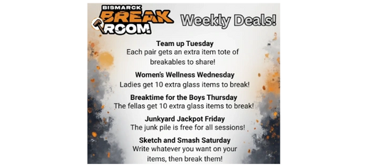 Bismarck Break Room offers a therapeutic and entertaining outlet for individuals ages 13 and older, that are seeking stress relief of everyday life or just for entertainment. Our unique "break room" facility provides a dedicated space where visitors can safely engage in smashing various items in order to relief stress, anger, or to feel an adrenaline rush.